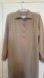 This vintage dress is a light brown, knee-length shift dress. It features a pointed collar, long sleeves, and a button-up front with four large gold buttons. The dress has a relaxed fit with subtle shoulder pads, embodying the classic 80s style.