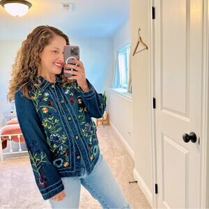 Vintage Guni Fashions Denim Floral Embroidered Button Front Top Jacket S