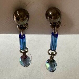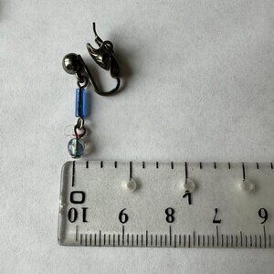 These lovely vintage gunmetal gray iridescent blue beaded dangle earrings feature a clip on closure for secure wear. The earrings showcase an elegant design with blue colored beads and silver accents, giving them a classic and funky bohemian flare. The earrings have a timeless appeal and are a perfect accessory for those who appreciate vintage and antique jewelry.