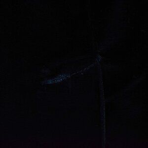 Black velvet, strapless, sweetheart neckline, bodycon, knee length, asymmetrical metallic blue waist sash with ruffle and rosette details, side zip closure, light boning in bodice.