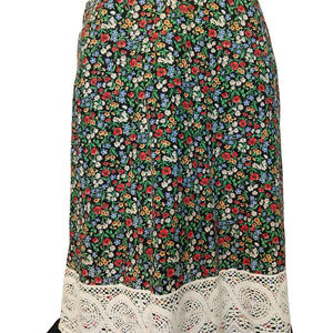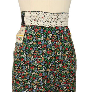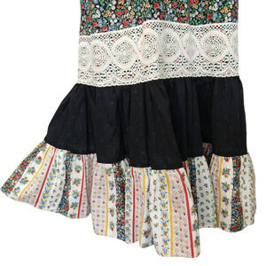 Vintage Jessica's Gunnies Gunne Sax floral calico tiered maxi skirt with crochet lace accents, zip & hook back, side pockets, and tie waist. No size tag, estimated at a 5, see measurements for best modern fit. Skirt version of the iconic leg o' mutton sleeve dark floral calico maxi dress. Measurements are approximate, lying flat.