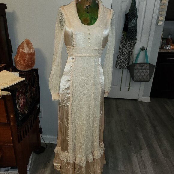 This gown was worn by my sister to her Senior Prom in 1979! This is a Black Label Gunne Sax by Jessica McClintock. There is some staining on the sleeve but other wise in good condition. It is a size 5 and she was 5' therefore it had to be hemmed significantly but never fear she made a cute clutch to match with the extra fabric. This is included as well. I hope that the collectors will love it as much as she did and as much as we loved her.