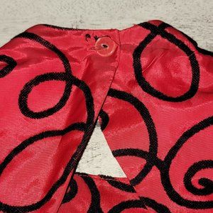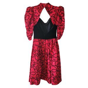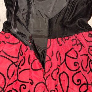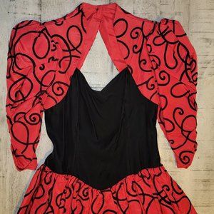 Velvet bodice. Shoulder Pads. Gathers sleeves. Crinoline in skirt. Zipper closure in back.