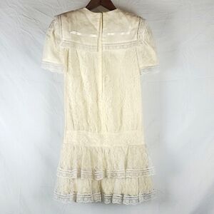 Vintage 80s Jessica McClintock Gunne Sax cream lace dress. Drop waist. Tiered skirt with lace hem. Lace and bow details. Large collar. Back zipper closure. Great condition. Size 8.