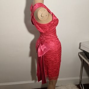 This hot pink lace vintage dress has a large satin bow in the back.