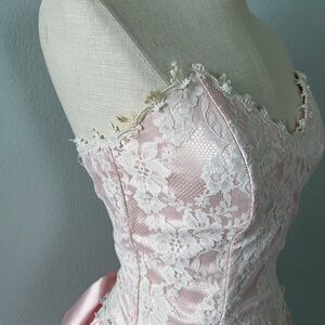 -Good vintage condition, some yellowing along underarm lace, lace on side of bodice