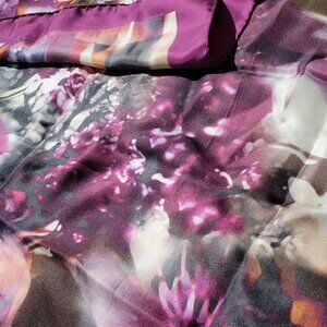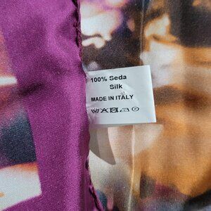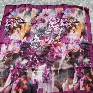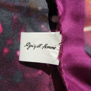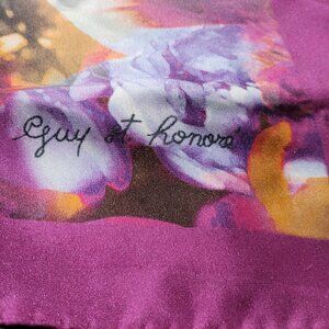 Vintage Guy St Honoré scarf from the 1970s with artistic flower pattern in various shades of purple, lilac, and orange. This is 100% silk with hand rolled edges, made in Italy. Measures about 33x33 inches.