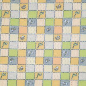 * ONE SIDE: CHECKERED WITH BEES, GRASSHOPPERS, AND DRAGONFLIES. OTHER SIDE: SOLID YELLOW