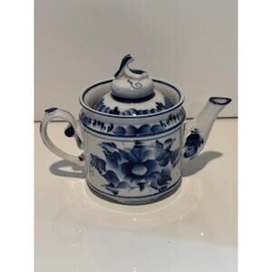 Vintage Gzhel Porcelain Tea Pot Chinoiserie Style Blue White Hand Made Russia