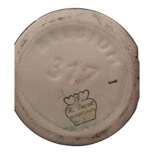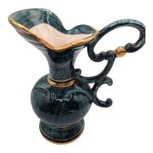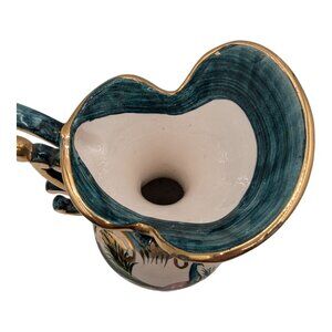 Add a touch of elegance and avian charm to your home decor with this vintage H. Bequet ceramic pitcher, featuring a majestic peacock and gold trim.