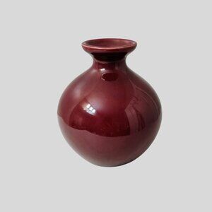 This charming vintage vase by Haeger showcases a rich burgundy  / dark red hue, embodying timeless elegance and craftsmanship. Its classic round silhouette is ideal for adding a touch of sophistication to any interior. Still has the original label on the bottom. With a history dating back to 1990, it serves as both a decorative piece and a collector's item.