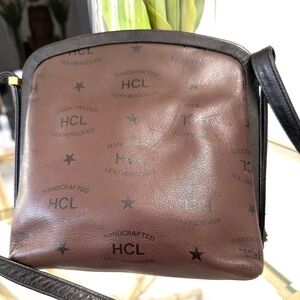 Rare and collectible HCL Handcrafted Leathergoods crossbody bag, crafted from genuine brown leather with all-over HCL logo and star motif. This piece features a bold gold-tone logo plate with engraved number (202587) and a structured framed clasp top closure, giving it true vintage charm.