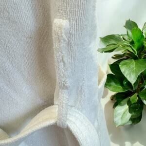This vintage Hilton robe is a cozy and stylish addition to any wardrobe. Made from heavy terry fabric, it features a classic white color and the iconic Hilton brand. Please note that one loop is fraying, but this does not detract from the overall quality of the robe. It is perfect for lounging around the house or wearing out for a casual day. Don't miss out on this unique piece of vintage clothing! One loop on robe is fraying and minor discoloration on collar. Final sale.