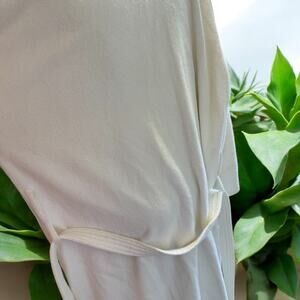 This vintage Hilton robe is a cozy and stylish addition to any wardrobe. Made from heavy terry fabric, it features a classic white color and the iconic Hilton brand. Please note that one loop is fraying, but this does not detract from the overall quality of the robe. It is perfect for lounging around the house or wearing out for a casual day. Don't miss out on this unique piece of vintage clothing! One loop on robe is fraying and minor discoloration on collar. Final sale.