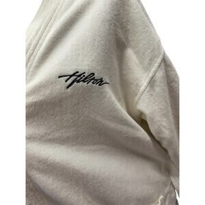 This vintage Hilton robe is a cozy and stylish addition to any wardrobe. Made from heavy terry fabric, it features a classic white color and the iconic Hilton brand. Please note that one loop is fraying, but this does not detract from the overall quality of the robe. It is perfect for lounging around the house or wearing out for a casual day. Don't miss out on this unique piece of vintage clothing! One loop on robe is fraying and minor discoloration on collar. Final sale.