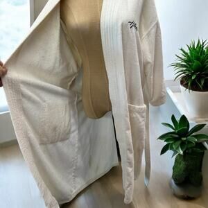 This vintage Hilton robe is a cozy and stylish addition to any wardrobe. Made from heavy terry fabric, it features a classic white color and the iconic Hilton brand. Please note that one loop is fraying, but this does not detract from the overall quality of the robe. It is perfect for lounging around the house or wearing out for a casual day. Don't miss out on this unique piece of vintage clothing! One loop on robe is fraying and minor discoloration on collar. Final sale.