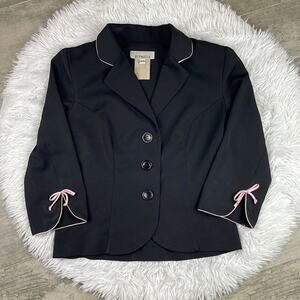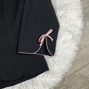 Black button blazer with pink trim around sleeve ends and collar. 3/4 sleeves. Cute pink bows on sleeve ends. Shoulder pads.