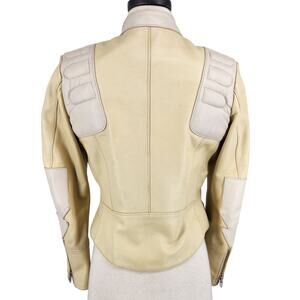 Elevate your biker style with this H&M Studio cream leather jacket in size USA 4. The quilted accents and band collar add an edgy touch to this mid-length jacket. The jacket features a full zip and snap closure, and is lined with viscose for added comfort and warmth. Quilted padded details on shoulders and arrow patches on sleeves. Working front zipper pockets, inside pockets.