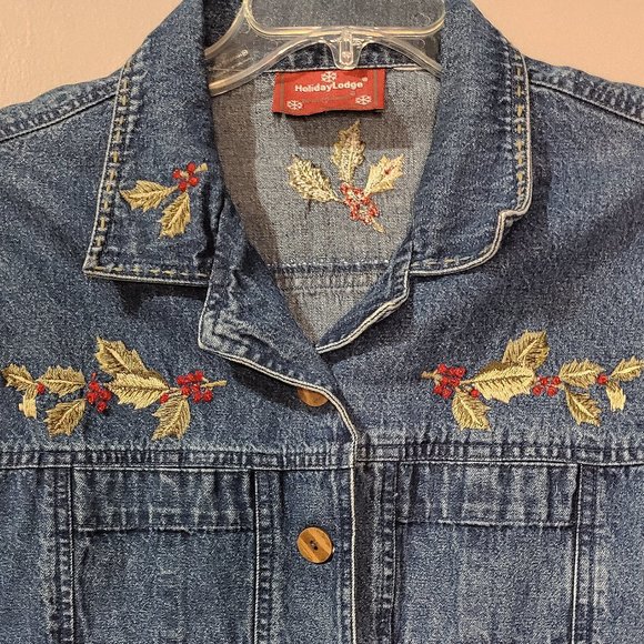 Vintage Holiday Lodge by Northcrest Womens Denim Buttoned Chambray Embroidered Holly Mistletoe Jacket, 20Wx24L