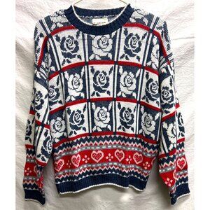 Vintage HOT CASHEWS Sweater L ARGE Roses Hearts Pattern Nordic 80s 90s