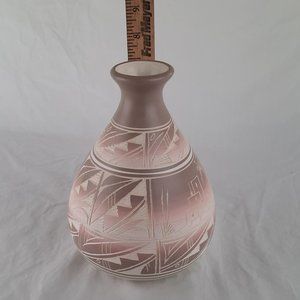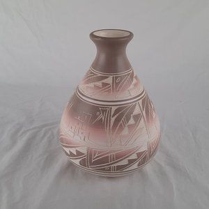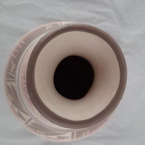Gorgeous hand painted preowned vase with tan, beige and pink coloring! In Excellent condition. It features a village scene and Native American symbols. "Hozoni" is one of the lines manufactured by Cedar Mesa Pottery factory in Blanding, Utah. The company hires Native American workers to decorate and sign the pots. It is not Native American pottery, in that the workers simply decorate the green ware pieces to the specifications of the factory, they do not create the pottery itself.