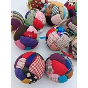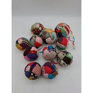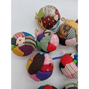 11 vintage homemade patchwork Christmas round ornaments. 3 are 3" wide and 8 are 2.5" wide. Good condition....minor wear from use. Thanks for looking!