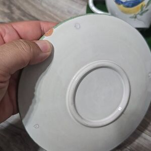 these were all hand painted, so the colors may vary. Each cup has two birds on them. There are minor chips in 3 cups as pictured and 1 saucer as pictured (very minor)