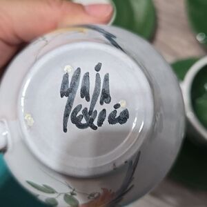Vintage HTF Maja Mexico Pottery Cup & Saucers Hand Painted Birds - Green Trim