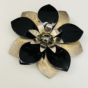 Vintage HUGE Black Enamel Petals Flower Floral Brooch Mixed Metals Nice 1482