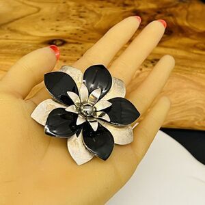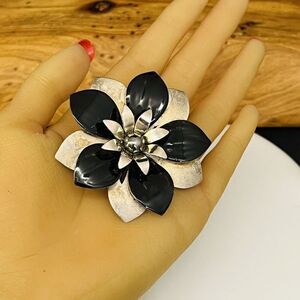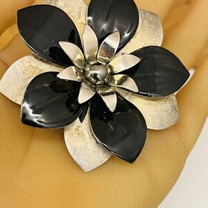 Vintage HUGE Black Enamel Petals Flower Floral Brooch Mixed Metals Nice.