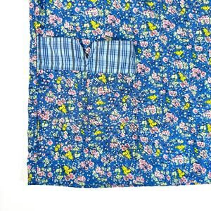 Vintage American Sweetheart by Haband short sleeve button-up shirt featuring a blue floral print with pink and yellow flowers. Designed with a collared neckline and contrasting striped patch pockets. Lightweight cotton blend with a relaxed oversized fit. Perfect as a casual everyday shirt, lounge top, or styled for cottagecore and retro-inspired outfits.