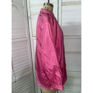 Great bright pink crinkle nylon outer with white cotton lining. Snap front. Elastic bottom is lacking elasticity from age. Front pockets. Light weight shoulder pads.