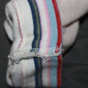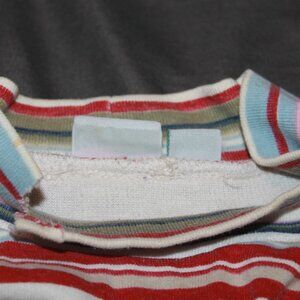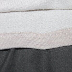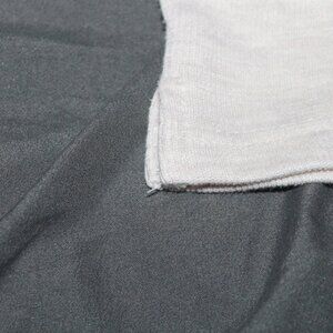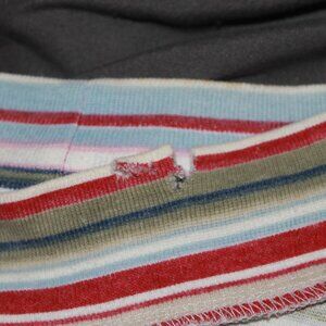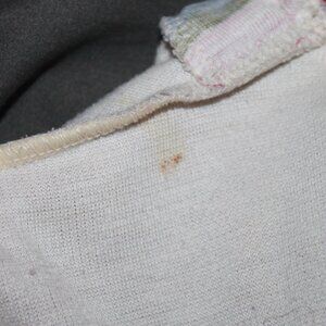 60% cotton 40% polyester. An area around the neck is torn. There are a few loose strings and a small stain on the inside.