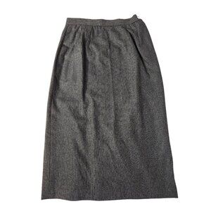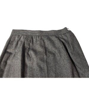Elegant vintage women's wool suit with a classic gray pinstripe design. Perfect for professional settings or sophisticated events. Includes a power jacket and matching pants, offering a timeless, tailored look.