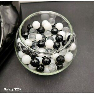 The cat is depicted holding a glass fish bowl with black, white & clear marbles, adding a touch of whimsy to the piece.
