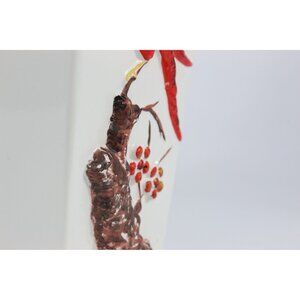 Vintage Haeger USA ceramic vase featuring a raised relief bird perched on a flowering branch. The vase has a glossy white glaze with applied colored detailing in red, yellow, and brown. The sculptural relief design gives the piece depth and texture, contrasting with the clean square form.