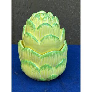 This ceramic set offers a unique artichoke design with vibrant green and yellow glazes. Functional and decorative, it adds charm to any dining table.