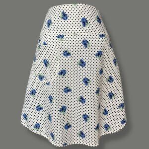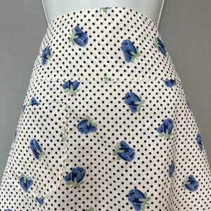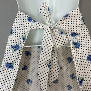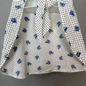 Vintage handmade apron in white with blue roses and black polka dots all over. Single front pocket. Tie at back waist.