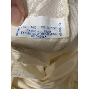 This is a vintage 1970s ivory half slip made of 100% nylon, in a size medium. It features lace trim and a high side slit, adding a touch of elegance to the slip. With a length of 23.5 inches, this slip is designed for everyday wear and would be a stylish addition to any lingerie collection.