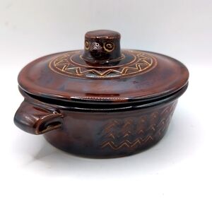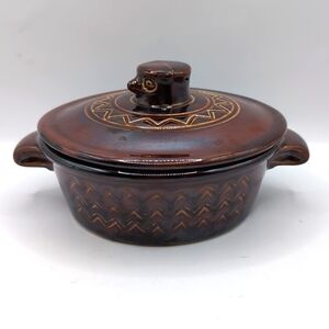 The unique pattern and brown color give it a rustic charm that is sure to impress. Double Handled. Artistic Lid.