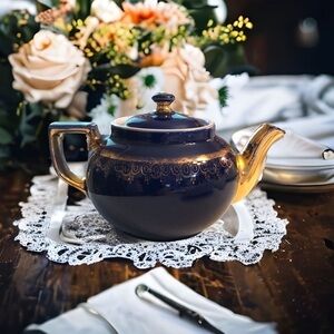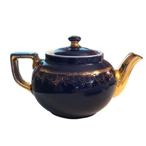 Vintage Hall Fireproof China Boston Shape Cobalt and Gold Teapot