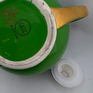 Add a touch of authentic mid-century charm to your kitchen with this stunning vintage teapot from the Hall China Company. This is the iconic "Rhythm" model, featuring a classic globe shape and a dramatic "over-the-top" handle that defines its Art Deco and MCM aesthetic.