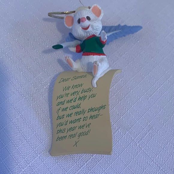 This little guy is marked Hallmark 1994 on back, which makes him officially vintage now. Cute little collectible mouse Christmas ornament sitting atop his dear Santa letter. There is on minor smudge on the letter. He is otherwise in excellent condition. Offers welcome. Bundle discounts.