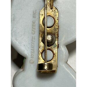 This charming Hallmark pin brooch features a festive mouse dressed in a red Santa hat and green-striped sweater, holding a golden bell. Its vintage design adds a nostalgic touch to holiday attire, making it a delightful accessory for collectors and seasonal enthusiasts alike.