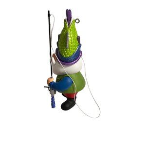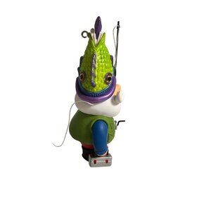 This ornament depicts a whimsical design of Santa wearing a fish helmet while holding fishing gear. A detailed collectible for holiday decor.