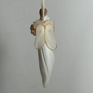 A delicate collectible ornament featuring an angel in an elegant gown with glitter accents. Ideal for holiday decorations or as a timeless keepsake.