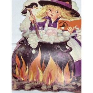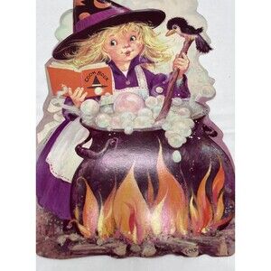 Vintage Halloween Die Cut Decoration Witch Cooking Cookbook Bird Cauldron USA