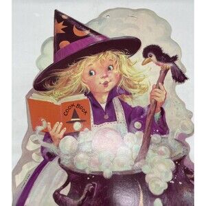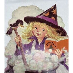 VTG Halloween Die Cut Decoration Witch Cooking Cookbook Bird Cauldron USA FERD.