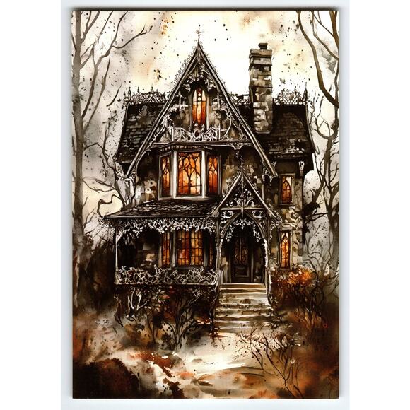 This striking vintage Halloween postcard features a detailed lithograph of a haunted Victorian-style house glowing with eerie orange light through its stained glass windows. The dark, gothic architecture is surrounded by leafless trees and misty shadows, perfectly capturing a spooky autumn atmosphere. The intricate wrought-iron detailing on the porch and roof adds a unique, atmospheric charm to this collectible postcard.