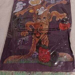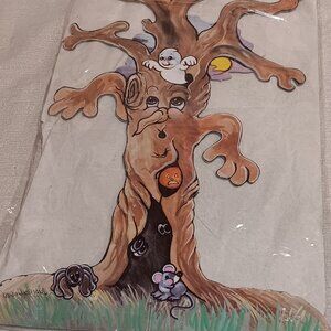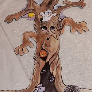 This Vintage Halloween Haunted spooky Tree Die Cut decoration is a large, 18-inch cardboard piece featuring a creepy tree with ghost design, perfect for Halloween. Signed by Judi Collins, this 1980s style decoration is suitable for windows, walls, or doors, and comes in a multicolor pattern. The indoor, retired piece is from the late 20th century and adds a touch of seasonal charm to any space, making it a unique collectible for teens, adults, and kids alike. Made in the United States, this die-cut decoration captures the essence of Halloween with its haunted tree theme.